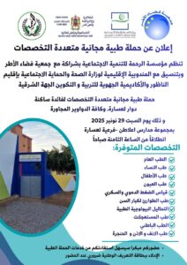 وستُقام هذه الحملة يوم السبت 29 نونبر 2025 بمجموعة مدارس إعـلالـن – فرعية لعسارة، حيث ستنطلق الخدمات الطبية ابتداءً من الساعة الثامنة صباحاً.