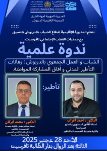 وتأتي هذه المبادرة العلمية في إطار الجهود المبذولة لتقوية التنسيق بين مختلف المتدخلين المؤسساتيين والمدنيين وجمعيات القطب الاجتماعي بتافرسيت، بما يضمن تعزيز المشاركة المواطنة ودعم مسارات التنمية المستدامة بإقليم الدريوش.
