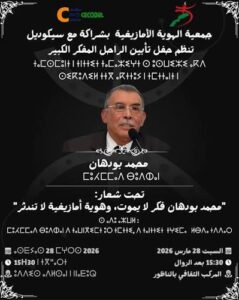 تخليدا لروح الفقيد واعترافا بمساره الفكري والنضالي الحافل، تعلن جمعية الهوية الأمازيغية، بشراكة مع سيكوديل عن تنظيم حفل تأبيني مهيب للمفكر الأمازيغي الكبير الراحل محمد بودهان. ويأتي هذا الحفل استحضاراً للإسهامات البارزة التي قدمها الراحل في الدفاع عن قضايا الهوية والثقافة والحرية، وتحت شعار يحمل دلالات عميقة: “محمد بودهان فكر لا يموت، وهوية أمازيغية لا تندثر”.